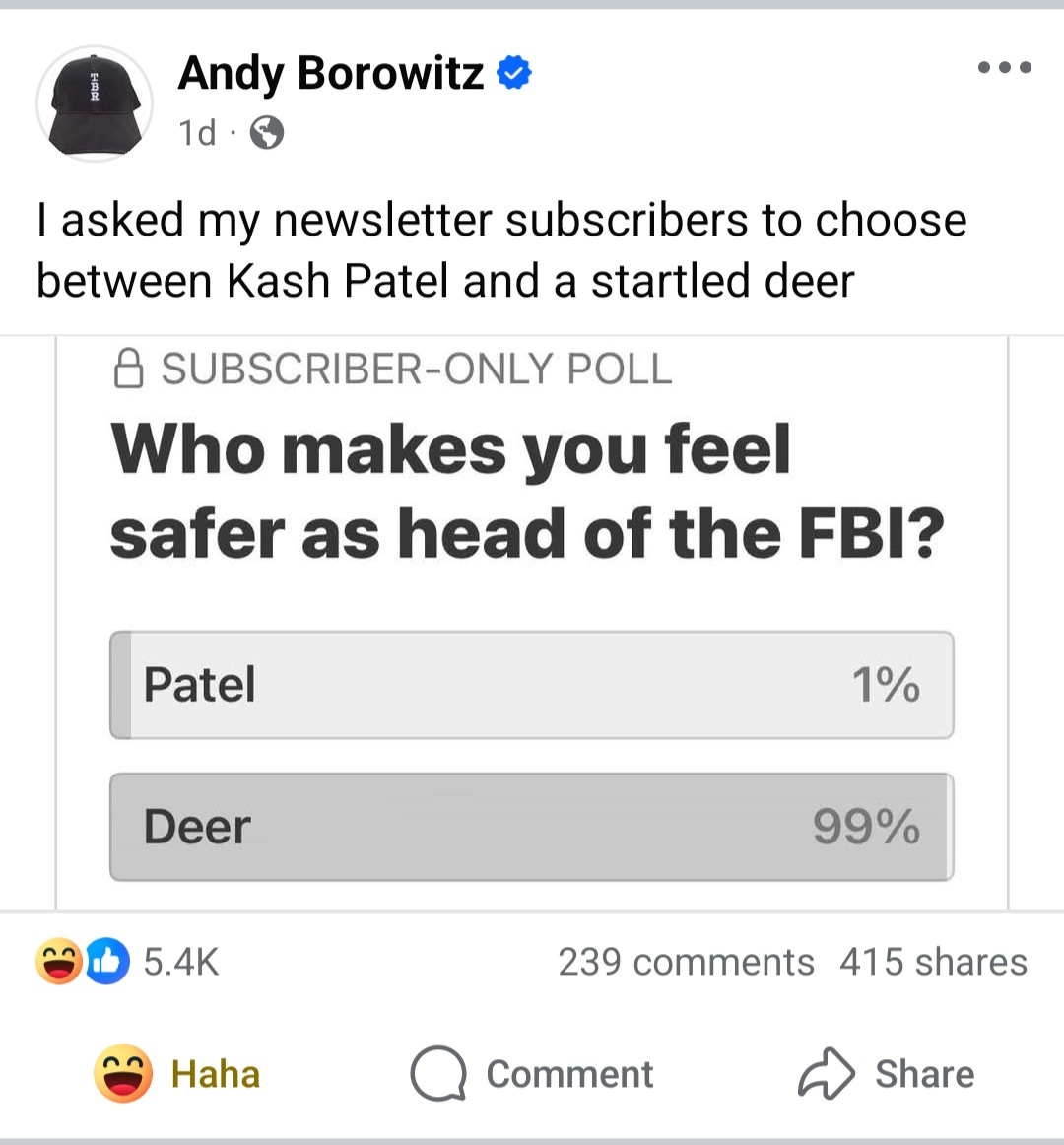It’s me — the deer. The one 99% of Andy Borowitz’s readers say would run the FBI better than you. You’ve probably seen that poll, though knowing your eyesight, maybe not. Let me read it aloud for you: ninety-nine percent. That’s unanimity with a margin of error smaller than your dignity.