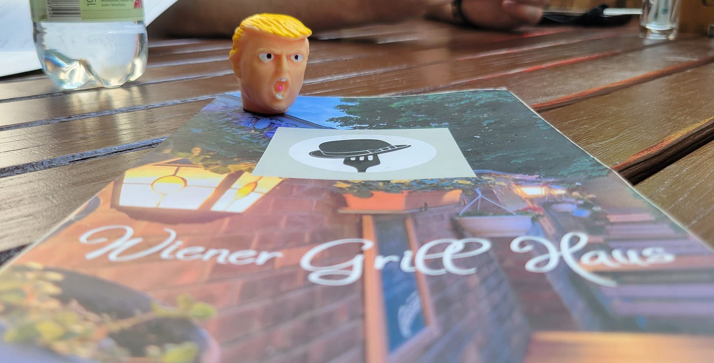 Back down the hill, we found refuge at a nearby restaurant with shaded outdoor seating — the Wiener Grill Haus, which sounds like a euphemism but was exactly what we needed: fried things, cold drinks, and a place to regroup. I ordered chicken fingers and fries. Lukas went with the Wiener Schnitzel. We both drank our beer like it was being rationed. The puppet sat between us on the table, staring at nothing.