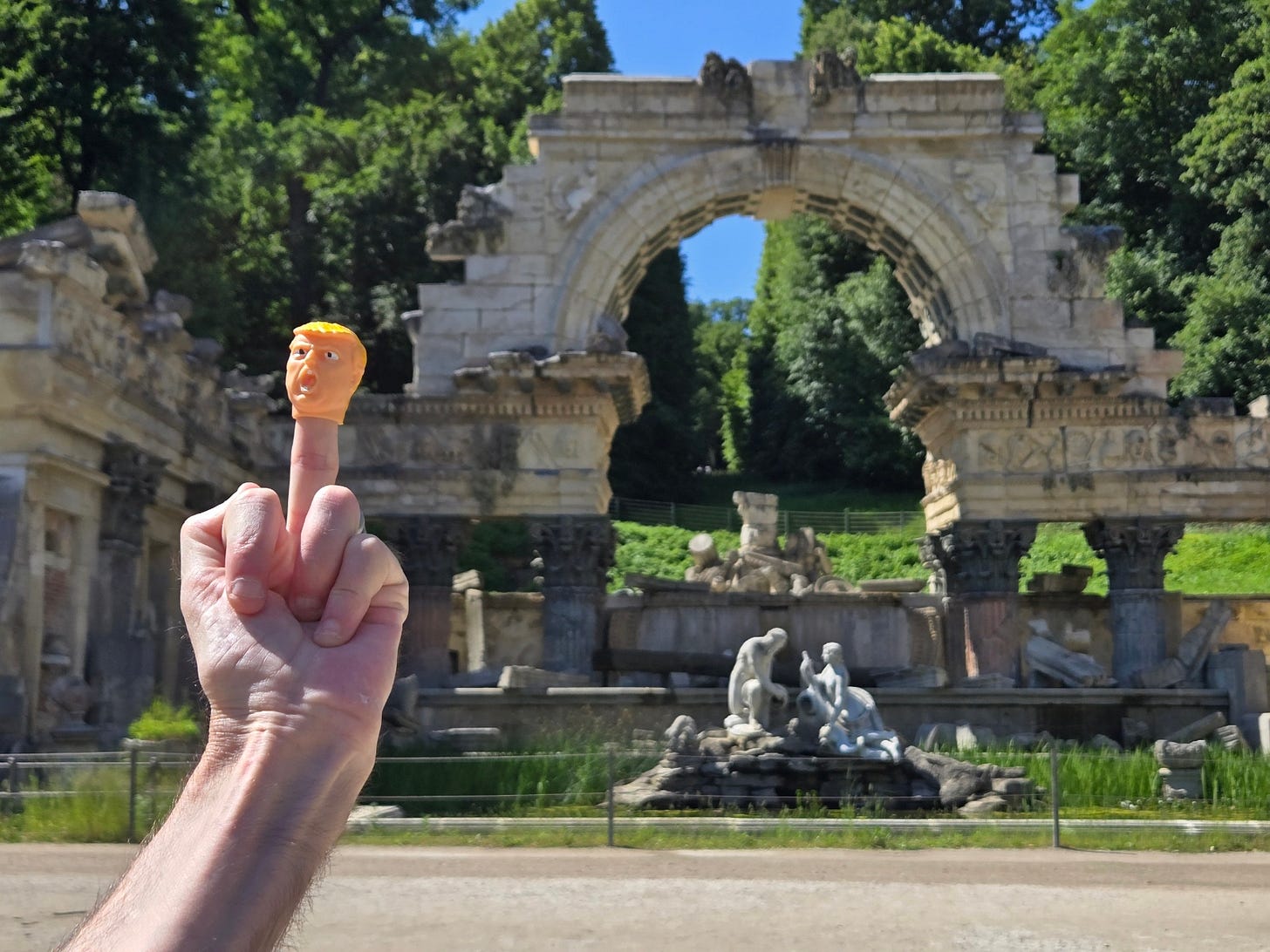 Let’s clarify that: a rubber Trump head with squinty eyes, orange-tinted skin, an open-mouthed scowl, and a weirdly squashed comb-over. No googly eyes. No body. Just a disembodied head that fit snugly over your finger—especially your middle one. We called him Krasnov, in honor of the KGB codename Alnur Mussayev had claimed was once assigned to Trump during his alleged recruitment by the KGP. It was a joke at first. A prop. Something to ease the tension of a trip laced with paranoia, history, and dead drops. But somehow, holding it up in front of imperial palaces made it feel less like satire and more like prophecy.