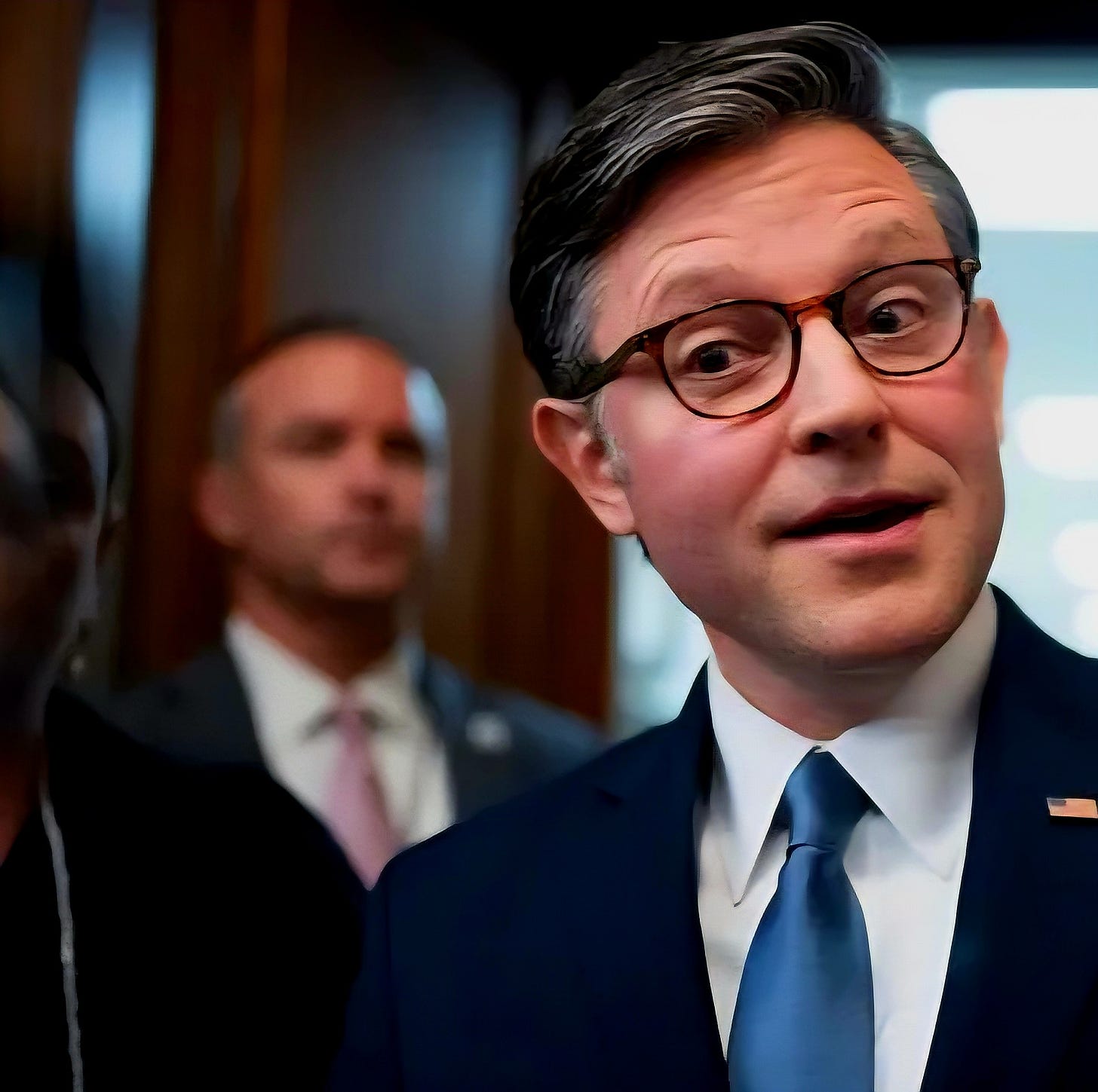 (Mike Johnson stumbles to the podium with his tie twisted like a noose he doesn’t realize he’s wearing. Reporters circle. The scent of flop sweat and panic fills the hallway.)
