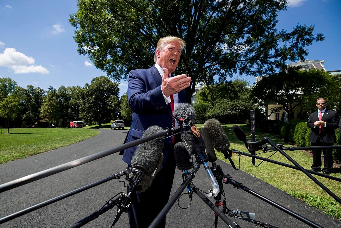 (Trump waves, turns the wrong direction, is gently spun toward the stairs by an aide, boards Marine One as reporters shout questions about math and morality.))