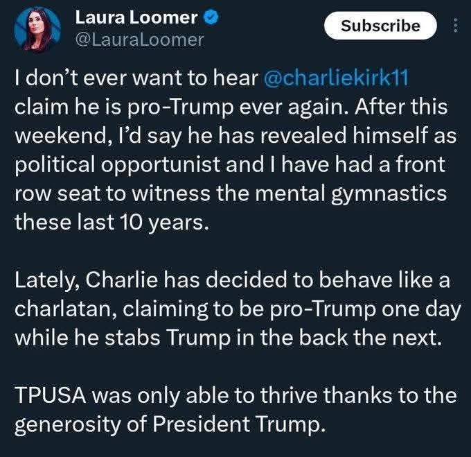 A couple of months ago, Laura Loomer was shrieking into her phone that Charlie Kirk had stabbed Donald Trump in the back. MAGA’s attack dog had him marked as a traitor, an apostate, another soft-boy conservative who wasn’t vicious enough for the blood cult. Then Kirk gets shot, and suddenly Laura is draped in black, clutching pearls, wailing like a widow at a mob funeral. That’s how fast the MAGA spin cycle runs: enemies are canonized, heretics become martyrs, and yesterday’s punching bag is today’s sacred cow. Loyalty isn’t about consistency. It’s about whatever Trump’s mood demands.