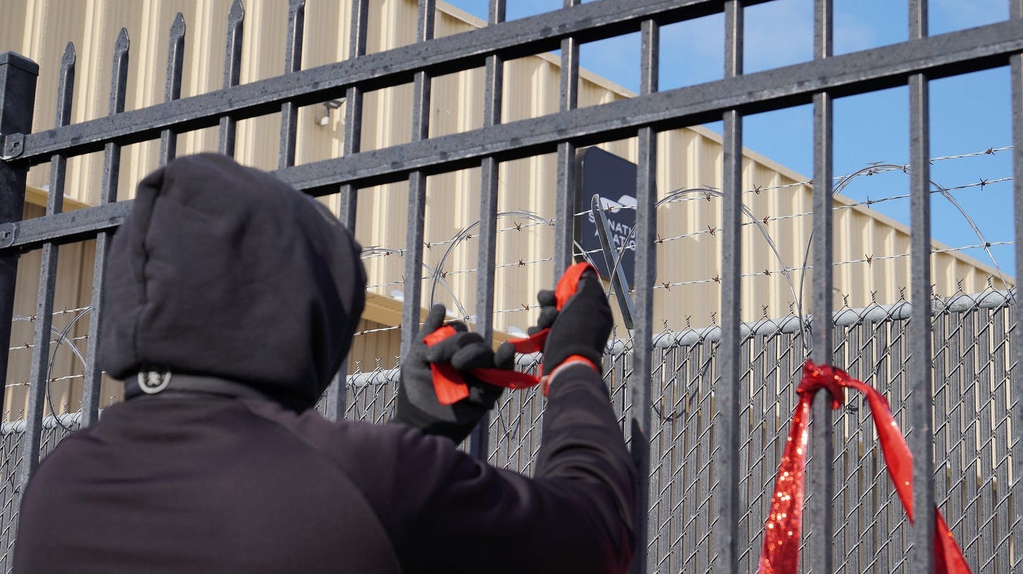 After several more speeches, clergy invoking ancestors, justice, and saving what’s left of the soul of America, we moved to the gates of Signature Aviation. There, hands trembling with cold and fury, we tied ribbons to the chain-link fence. Each ribbon was a vow. A memory. A refusal to let the state erase the people it disappears.