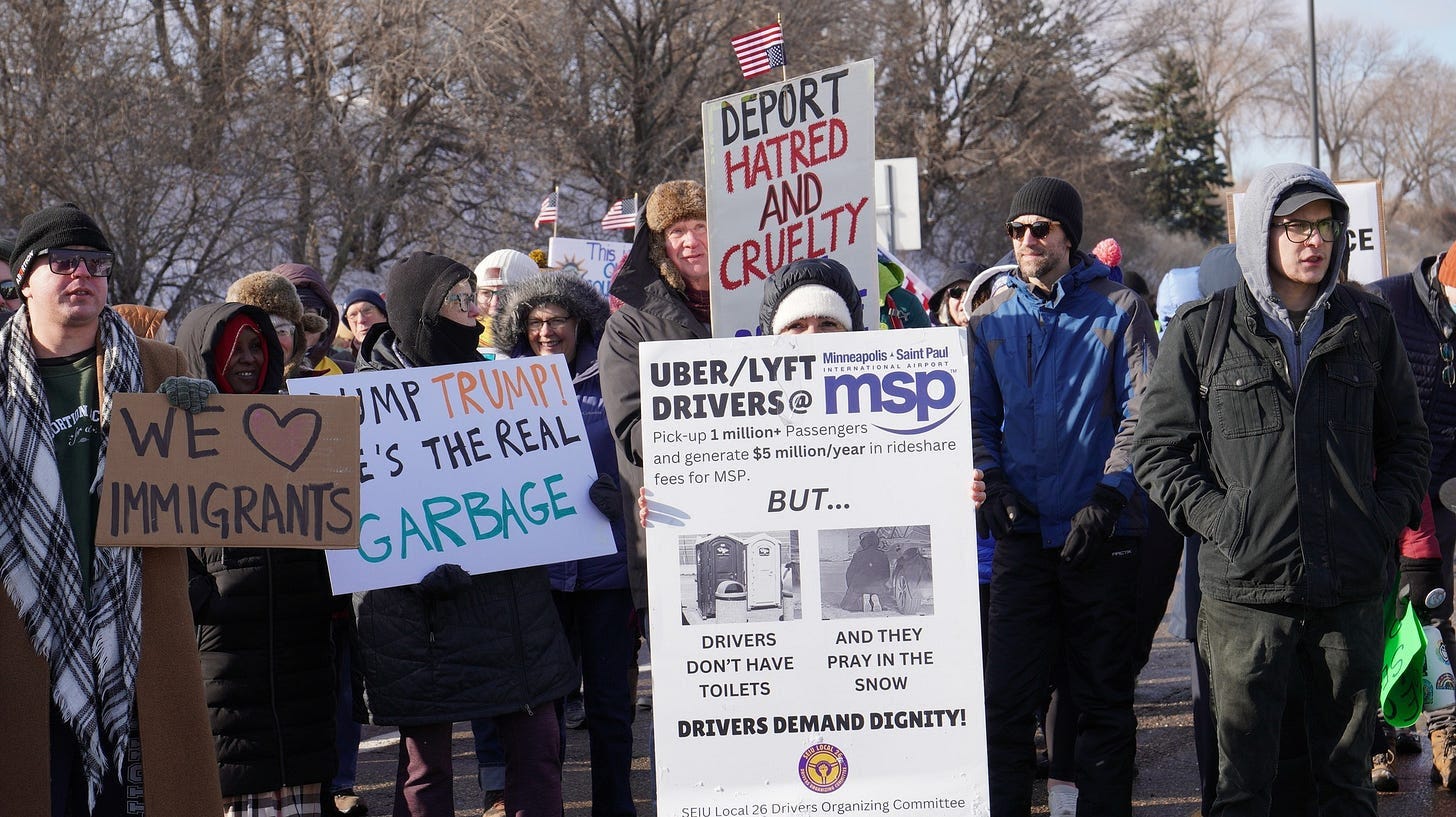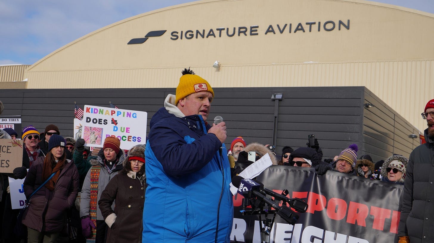 Once gathered at the hangar, a representative from UNITE HERE Local 17 delivered a blistering sermon on the exploitation of immigrant workers, those who keep this airport alive while being treated like replaceable ghosts. Then Nick Benson of MN50501 took the mic and tore the veil completely off the operation.