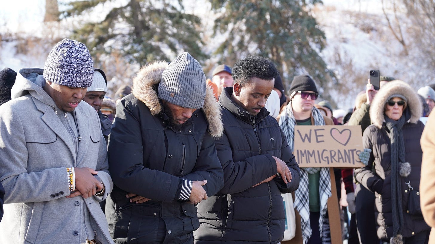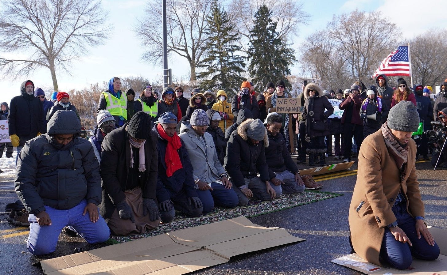 We marched to the Uber/Lyft driver waiting lot where Muslim immigrant drivers, who keep the airport economy functioning, are forced to pray in the snow, kneeling on asphalt beside dirty frozen porta-potties, because MSP, our “award-winning” airport, denies them a warm and dry room to worship the God they love or an indoor restroom to use.