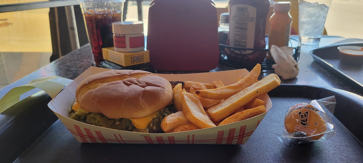 Sparky’s delivered on both. Burgers soaked in green chile. Fries that could punch you in the throat. And a fortune cookie that appeared mysteriously on our tray like a message from the Ministry of Surreal Omens.