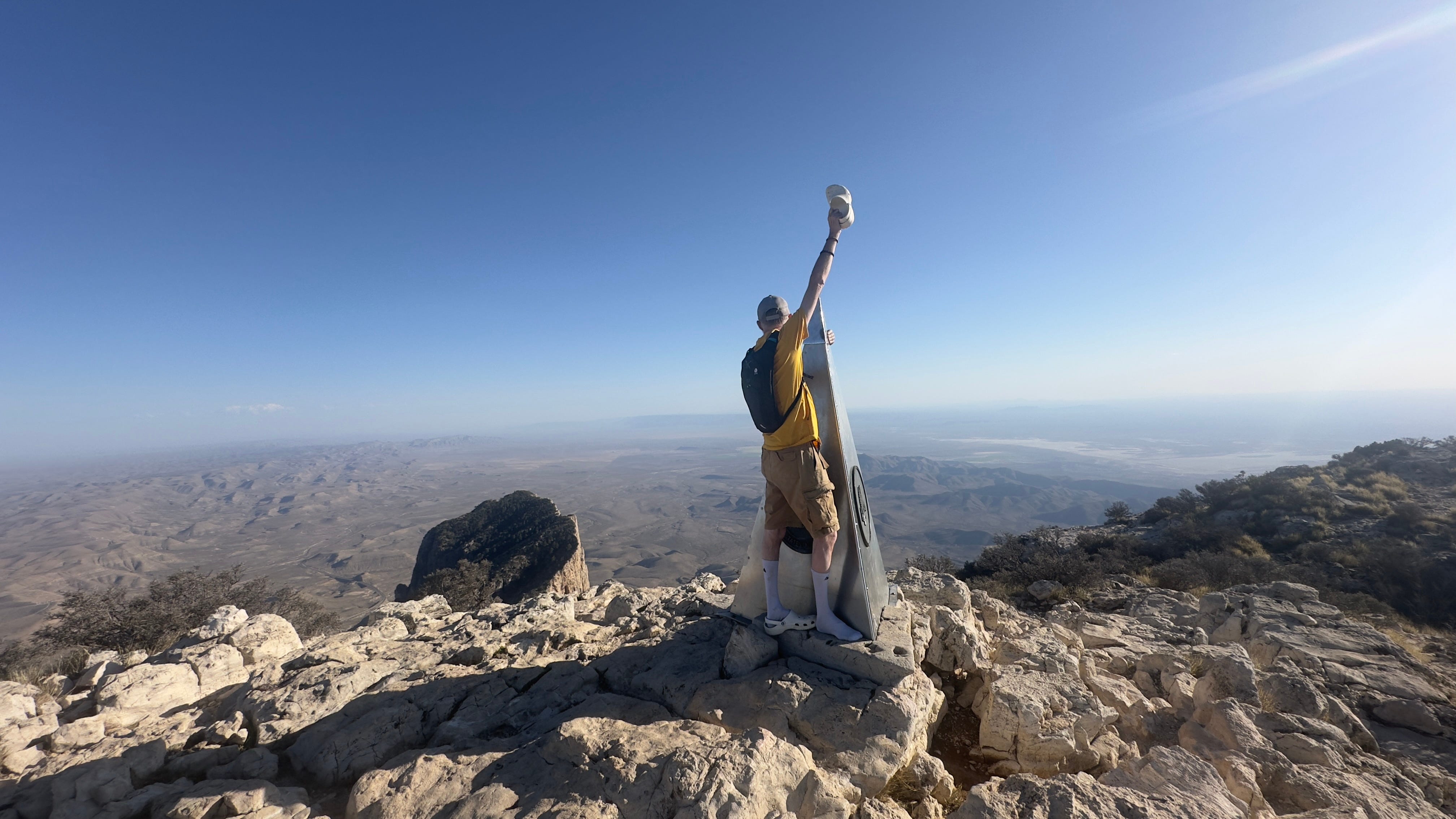 Guadalupe Peak: 8.5 miles round trip, 3,092 feet of elevation gain, and one member of the team in white Crocs. We’re not proud. But we’re not ashamed either. The Crocs made it. One was held aloft at the summit like it was the torch of Liberty or maybe just a sweaty, rubber-souled middle finger to common sense.